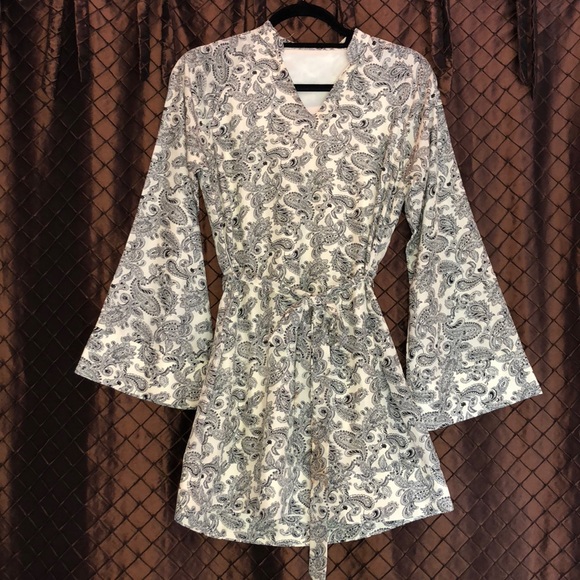 Retro style, paisley pattern dress featuring tie waste and flare sleeves.