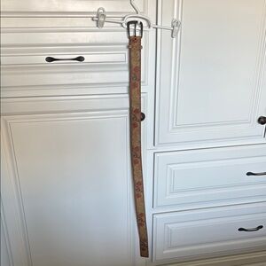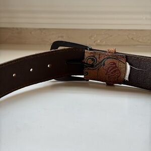 Enhance your outfit with this stylish paisley patterned belt. The intricate design features a blend of brown and tan colors, adding a touch of elegance to any outfit.