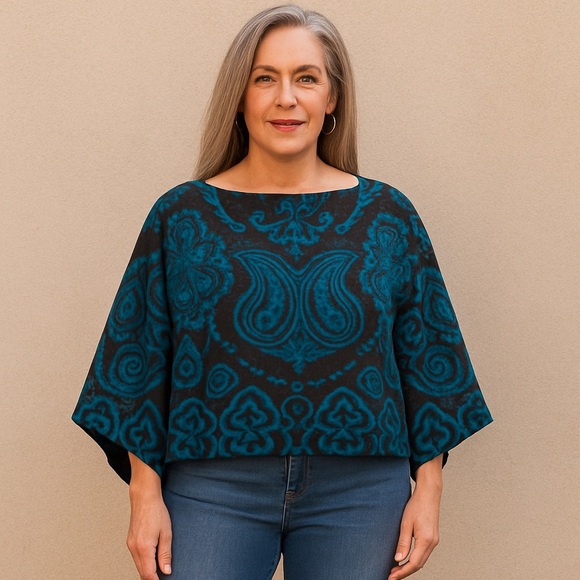 Paisley Patterned Knitted Layered Shawl Poncho Blue Black Medium Large XL