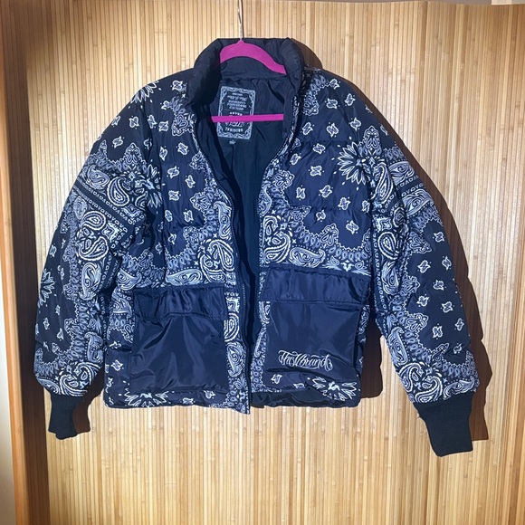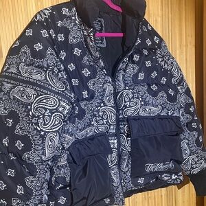 Stylish jacket with a paisley pattern. Features a black and white design. Super unique design and not your normal black buffet jacket. It fits like a S/M in menswear. In great condition