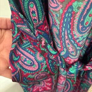 Elegant robe with a vibrant paisley pattern. Features shades of purple, teal, and pink. Pocket and tie waist.