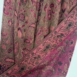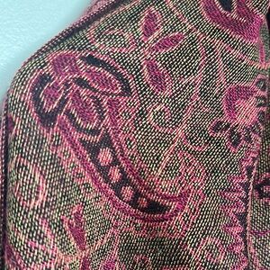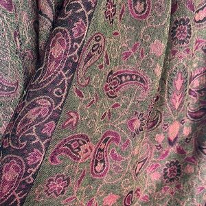 Elegant scarf with intricate paisley design. Features fringe detailing. Perfect for adding a touch of style to any outfit.