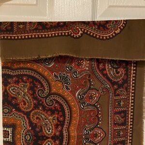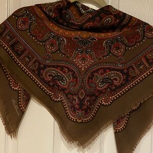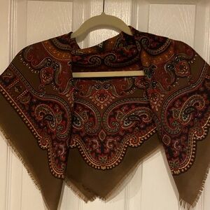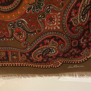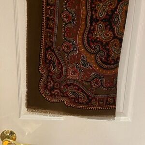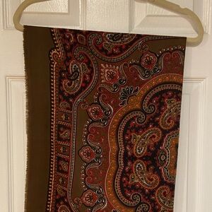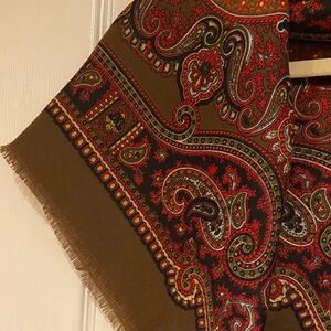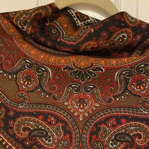 Elegant scarf with a paisley design. Features rich red, brown, and orange tones.