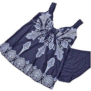 Paisley Print 2Pc Swimdress Women Plus Size 16-28 Navy Blue Wide Strap Swimsuit