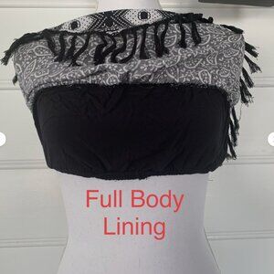 This is the perfect cropped halter top for summer by PS Erin Wasson and purchased from PacSun. It features fringe all the way around and a black & white bandanna style with paisley print. It slips on, is fully lined around the bust in front and back and has elastic on the way around. It is in excellent used condition with no signs of wear. Please feel free to send me any questions or make an offer!