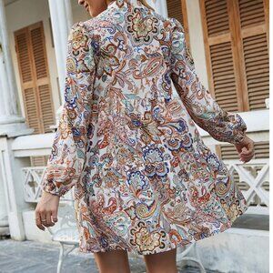 — Paisley bohemian style short dress with balloon sleeves & a v-cut neckline —
