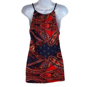 Elevate your style with this chic paisley print halter top. Featuring a vibrant mix of red and orange hues, this top is perfect for any occasion. Pair it with your favorite jeans or skirt for a trendy look.