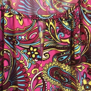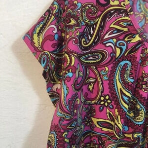Eye-catching paisley print blouse, perfect for adding a pop of color and pattern to your wardrobe. Featuring a vibrant mix of pink, yellow, blue, and other hues, this short-sleeve top has a flattering silhouette with gentle ruching at the neckline. The lightweight fabric ensures comfortable wear, making it ideal for warm weather. Pair it with jeans for a casual daytime look, or dress it up with a skirt for a night out or a fun vacation.