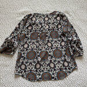 This easy to wear blouse features a split V-neck front, 3/4 length sleeves with button tab and a curved hemline. The print is a multicolor paisley medallion pattern in blues, oranges and pink on a cream background and is similar to a Veronica Beard pattern.