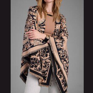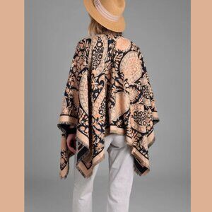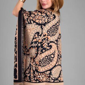 Elevate your wardrobe with our Paisley Reversible Ruana. Inspired by our best-selling reversible scarves, this luxurious piece features a silky, comfortable fabric and bold paisley patterns in black, beige, and peach. The delicate fringed hem adds texture and style. Perfect for layering over a turtleneck, dress, or any outfit you want to elevate this versatile and luxurious accessory will keep you warm and stylish.