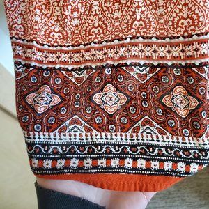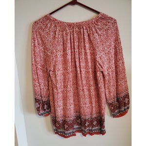 Looks great with dress pants or jeans - very versatile top. Fits like a medium.
