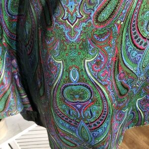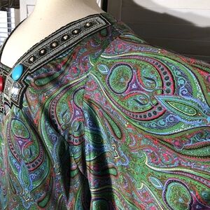 Elegant paisley dress with jewel details and a flattering V-neck. The dress showcases a beautiful blend of green and blue hues.