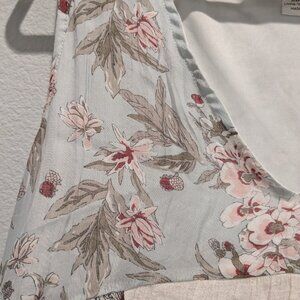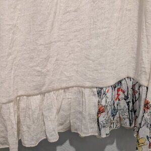 Simply fun, carefree, sleeveless dress with a V-neckline, a ruffled hem and a drop waist. The dress is lined with linen/cotton fabric. So pretty and fun to wear!!! It has the prettiest flower designed fabric around the bodice and sides.