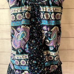Paisley and Floral halter strap tank top. This tank top is black with purple, blue, white, and beige colors in the patterns. The body is a paisley and floral horizontal striped pattern. There is a complimentary floral pattern that is centered in a rounded section along the neckline in the front. This same is on a stripe down the center front, on the ruffled peplum at the bottom, and on a centered section along the top of the back. There is a square of stretchy smocking centered in the back. The halter straps are a braided string. It is pre-owned, with very subtle fading, and is in great condition.