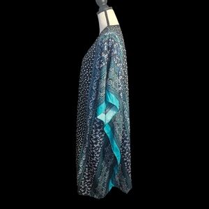 Soft and silky robe with accents of roses and paisley. Robe has 3 hook closures down the front. This Robe drapes beautifully.