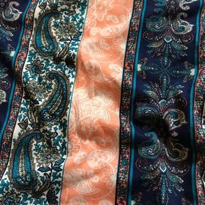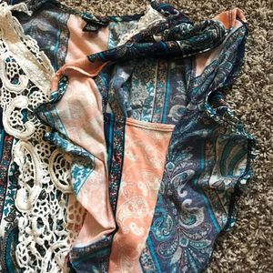 Really cute summer top extremely comfortable soft light material really nice lace pattern on the front. A bit short so could be a crop top on some. Peach tea or off-white navy blue