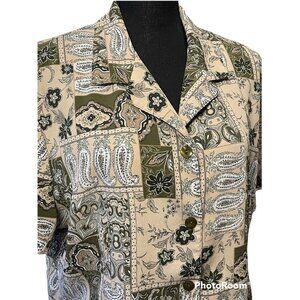 Vintage Briggs cream paisley short sleeve button front shirt in size 18. The multi-colored design adds a vibrant touch to your ensemble, crafted from comfortable polyester.