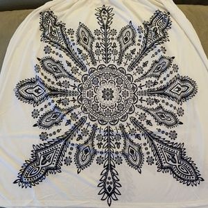 A light cream background with navy blue print. 95%poly 5% spandex with an elastic band under bust