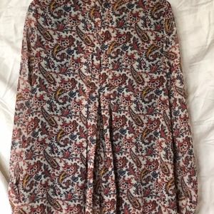 The blouse is done in a paisley print that buttons up the front. It has a collar. The colors are ivory, red, yellow and blue. It has long sleeves which can be converted to 3/4 inch sleeves. It is washable. It comes with a dark blue sham and is hip length. The brand is Simply Noelle. Peat going uptake back.