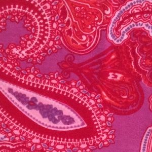 Red, pink and lavender cotton t shirt. Interesting neckline dresses up this soft and comfortable tee.