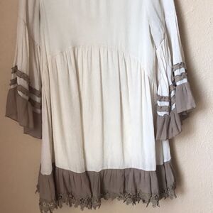 Boutique tunic/dress in excellent condition Cream colored with dark tan ruffles and lace Super cute! Size small
