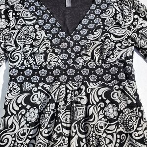 • Gorgeous v-neck top with paisley & floral designs allover. Consists of an outer mesh layer & a solid black lining for coverage.
