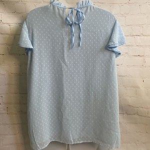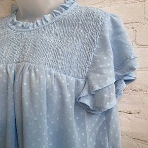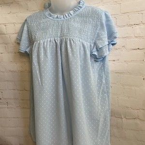 This high-neck, smocked, loose-fitting blouse is perfect for casual wear or the office! Flutter sleeves and a chiffon overlay with swiss dots throughout, this shirt is perfect for Spring or to wear with a cardigan over. Tie neck gives this a unique finish. Super soft, and only worn a few times. Excellent, barely worn condition.