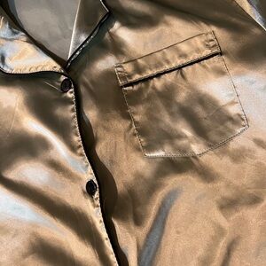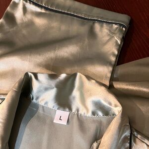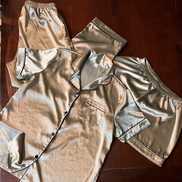 Women’s silk pajama set like new, maybe worn once. Top, shorts and pants size L fits a little more like a M.