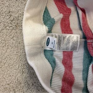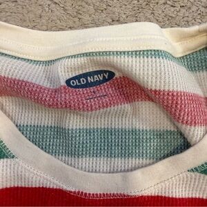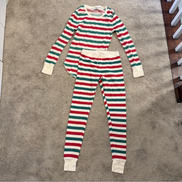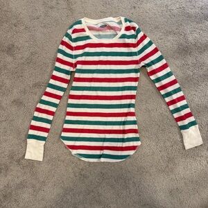 Red, green, and white striped Christmas or holiday pajama set. Thermal long sleeves with pants. Top is a size small, bottoms are a size extra small.