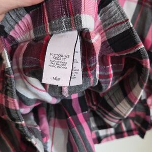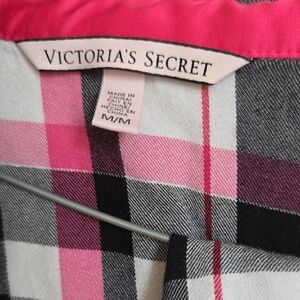 Victoria's Secret plaid button-down with pants and embroidered logo. Polka-dot trim along the collar. Lightweight, casual style for lounging or layering.