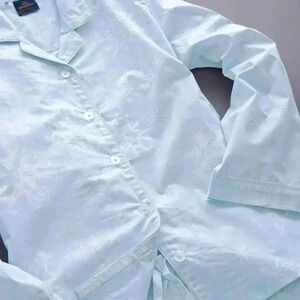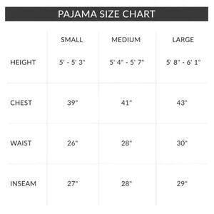 Pajama top has buttons for closure, bottoms have elastic waistband.