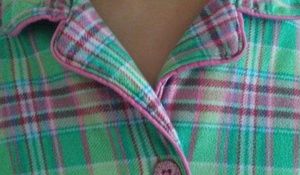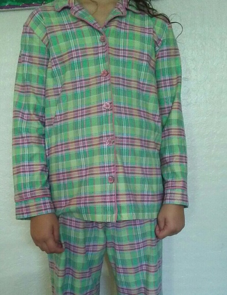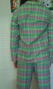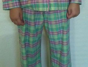 Green and pink plaid button up Pajama set. With pink glitter buttons and elastic waist.