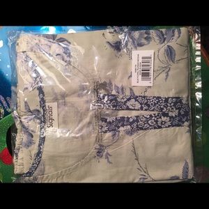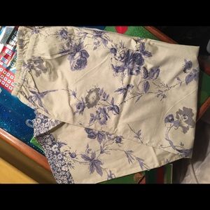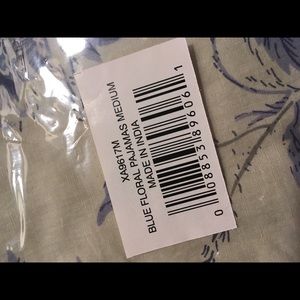 Woman’s MED blue floral pajamas, the pants have a tie string and come a little above my ankles when I hold them up to me (I’m 5’7) with a tunic shirt that matches very light weight. Brand new still in the package I only opened to take photos.