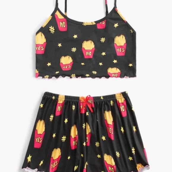2 piece french fry pj set size large fits up to a size 12 in women spandex and lots of stretch material is very giving great lounge set new never worn