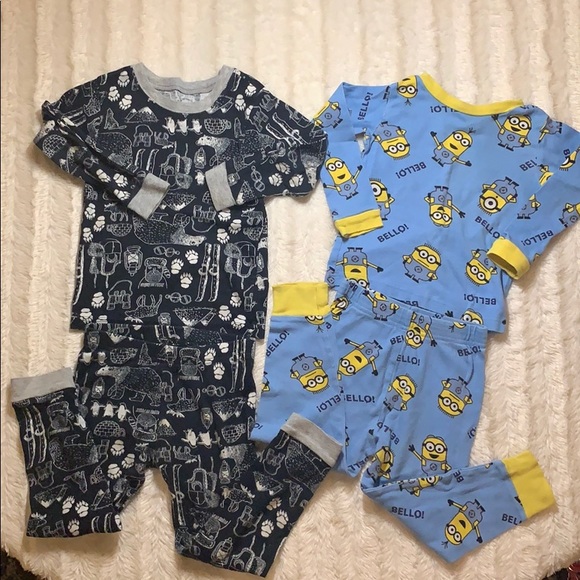 2 pajama sets long sleeve and pants. Carter’s wild alaskan theme set and Despicable me minion set. The minion shirt has the size tag cut off.