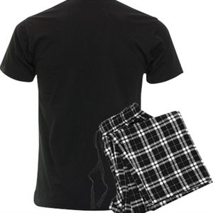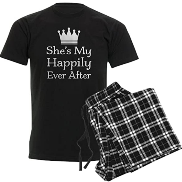 Black pajama shirt with personalized inscription "she's My happiness" with black and white pajamas bottoms. just in time for Valentine's Day.