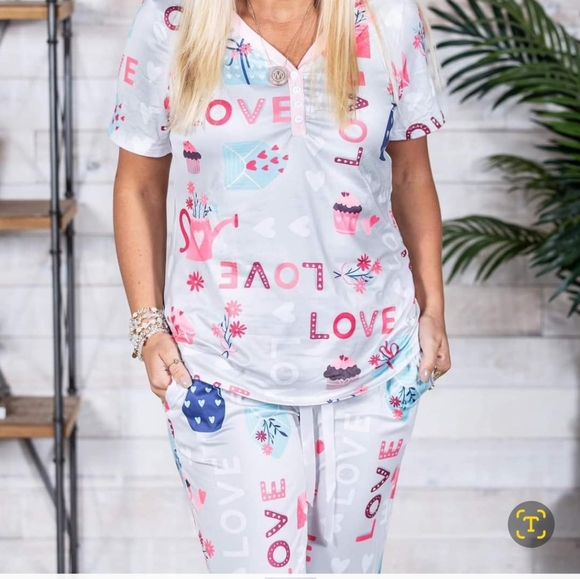 love pattern short sleeve long pants drawstring and pockets butter soft material