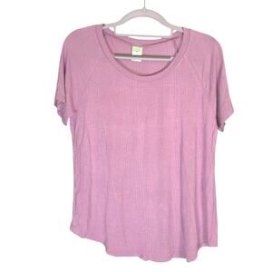 Pajamas set in soft gentle knit with loose mini rib knit t-shirt top and semi-elastic waistband wide leg pants.