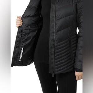 Stylish black puffer jacket by Pajar. Features a hood and zip closure. Perfect for cold weather.