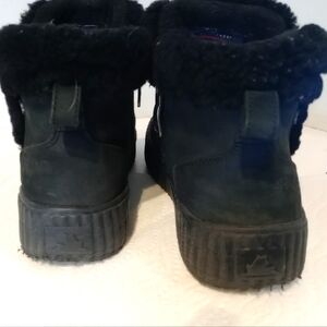 Great pair of Ankle Boots by Panjar. Black Suede with Black Shearling Trim. Warm to -22 Fahrenhit. BUT SEE the back edge of heel has been worn down some
