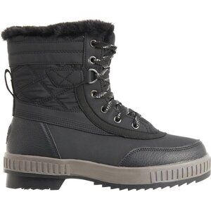 Women's Pajar Canada Karley Snow Boots feature a Pajar-Tex waterproof, breathable membrane and seam-sealed construction for ultimate protection. The synthetic and quilted textile upper is insulated to withstand temperatures as low as -22°F (-30°C). Designed with a lace-up front, padded tongue and collar, plush faux fur lining, and a removable cushioned footbed for comfort. The grippy lugged rubber outsole ensures stability. Size 37 EUR (US 6-6.5), in black, brand new in box.