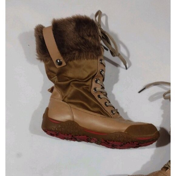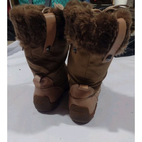 Pajar Garland Snow Boots. Size 9-9.5. Tan. Fur trim. Waterproof. Lace up. In nice, preowned condition. Minor wear to bottoms. Small crack on outer sole as shown.