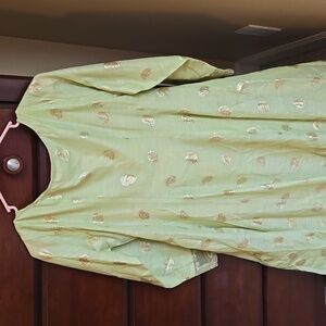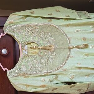 Beautiful embroidered pakistani 3 piece suiting apple green color. Flared dress with wide leg pants and organza dupatta. Size small. worn only once.