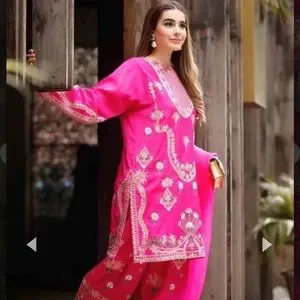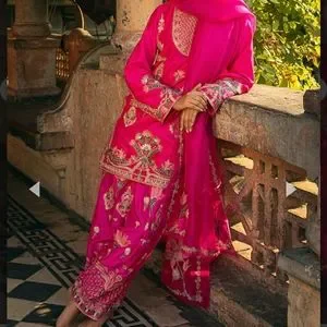 Hot Pink grip floral embroidered shirt paired with signature traditional aari work shalwaar. Organza dupatta embroidered