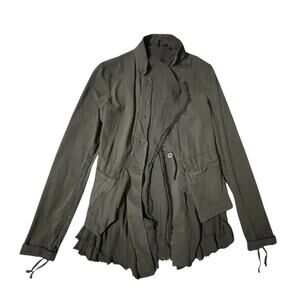 "A medium weight stretch jacket in a fitted shape with a singular button to fasten. Double layered hems with frayed cotton details add to the distressed appearance. Two side pockets with contrast black rope features. "