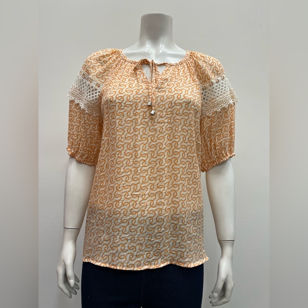 Palm Rio printed short elastic sleeve notch neck Blouse with tie neck and lace details.