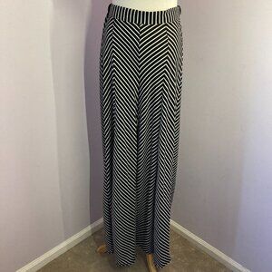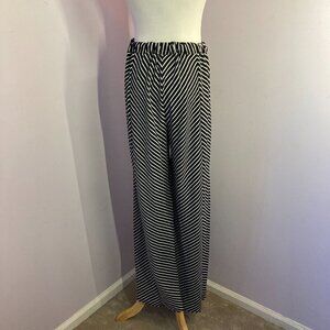 Black striped panels with flat front and elastic waistband in back.(The elastic has a tendency to curl)