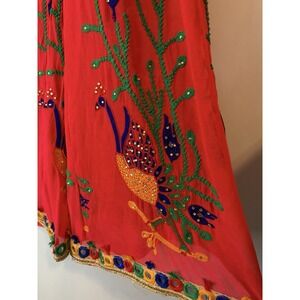 These Palazzo Pants feature an embroidered floral pattern with peacocks, adding a touch of artistry to your outfit. The wide-leg design and harem style offer a relaxed fit, while the elastic waist ensures comfort and ease of wear. Made from a blend of polyester, rayon, and cotton chiffon, these pants are perfect for various occasions including parties, casual outings, and formal events. The red color and high-rise waist give these pants a bold and stylish look, making them a versatile addition to your wardrobe.