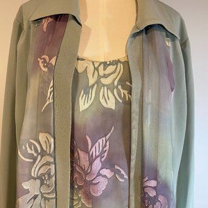 Palazzo Pants with shell & Jacket, Bassonelli Brand, size 16. full kit height from shoulder - 56". Seafoam green, Pastel lavender flower hand painted throughout. Rhinestone embellished buttons. Silk crip material jacket