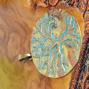 Pale Golden & Teal Colored Tree Of Life And Moon Bigger Pendant